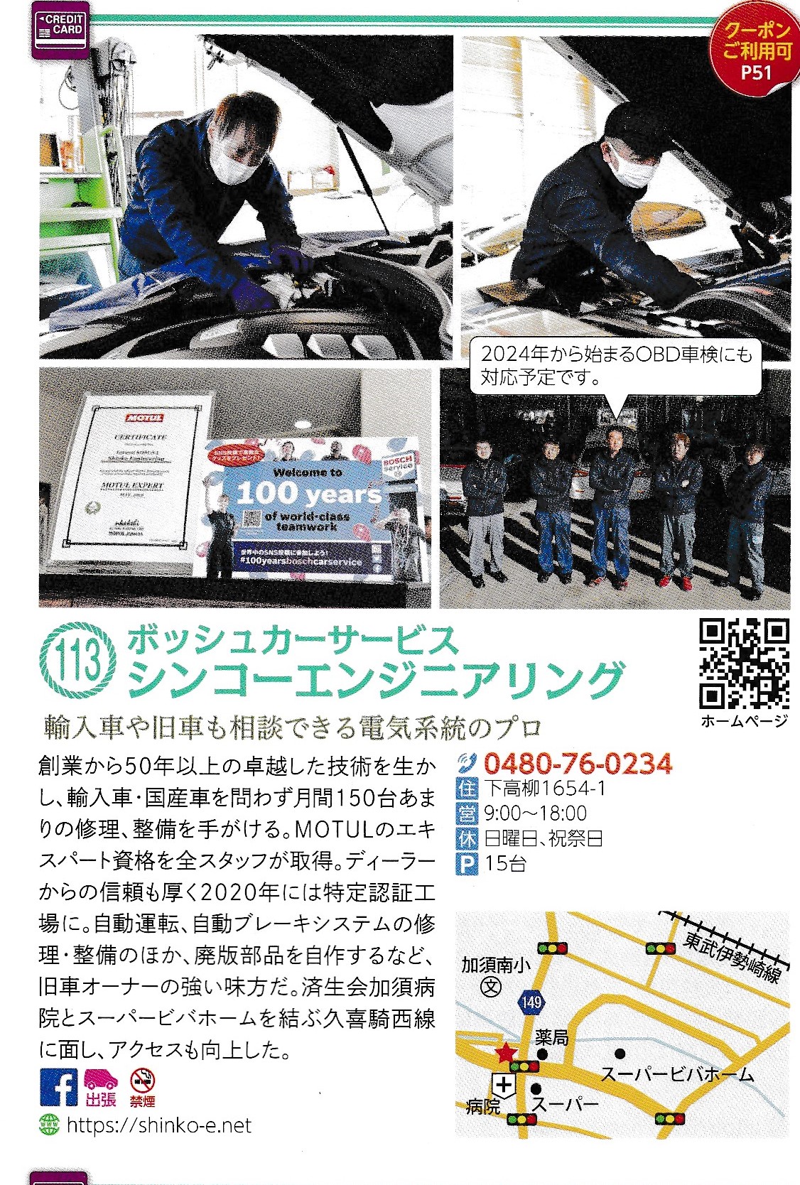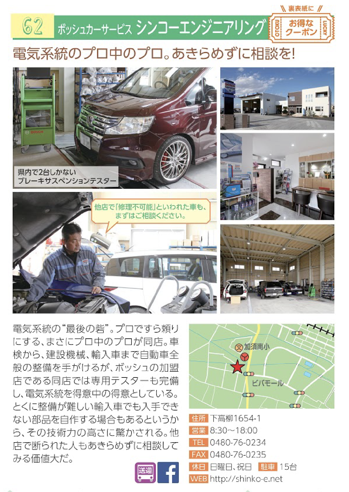 | 業種 | 自動車電装品販売整備、一般整備、車検整備、架装作業(カーナビ・バックカメラ・ドラレコ等取付) |